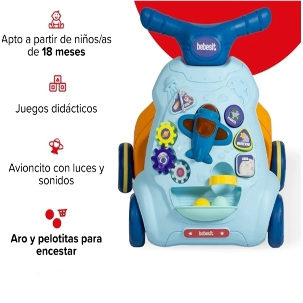 Este caminador incluye un panel didáctico con engranajes giratorios, formas para encastrar, un librito incorporado y un avión desmontable con luz y sonido (funciona con baterías AA, no incluidas), que estimulan el desarrollo sensorial y la motricidad.